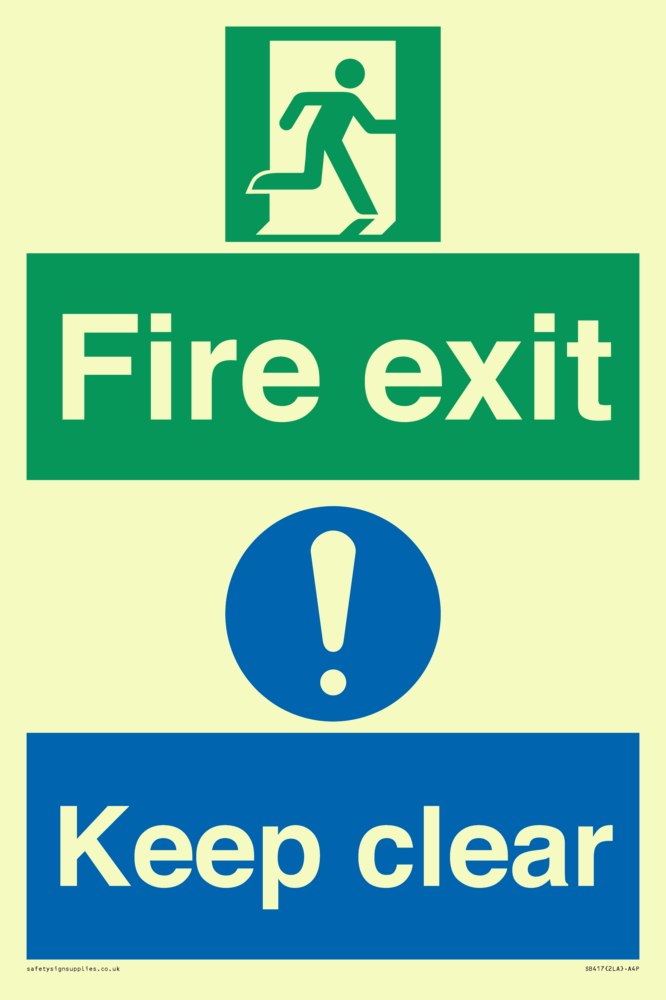 Fire Exit Keep Clear dual safety sign: running man facing right and exclamation in blue circle