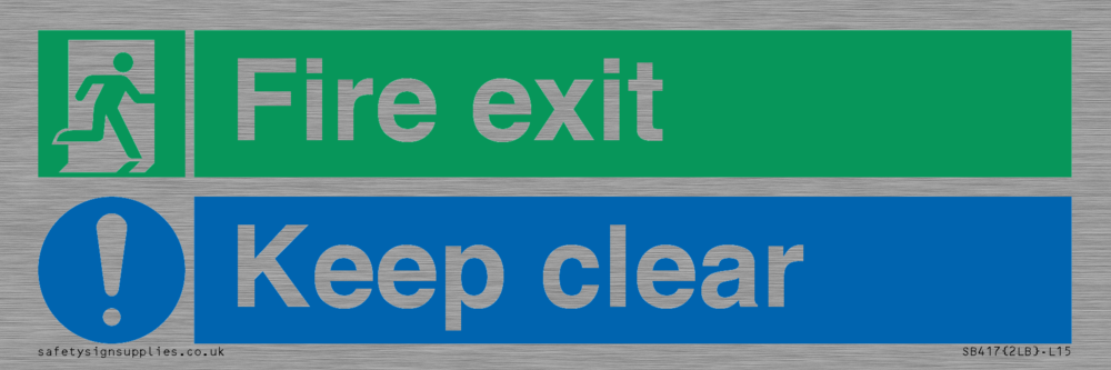 Fire Exit Keep Clear dual safety sign: running man facing right and exclamation in blue circle
