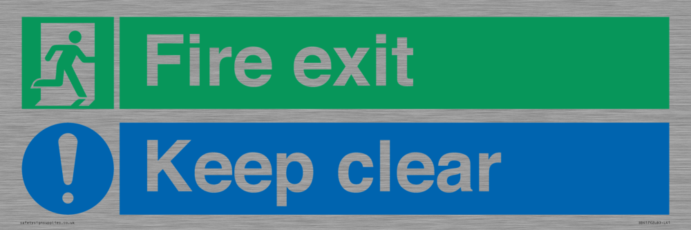 Fire Exit Keep Clear dual safety sign: running man facing right and exclamation in blue circle