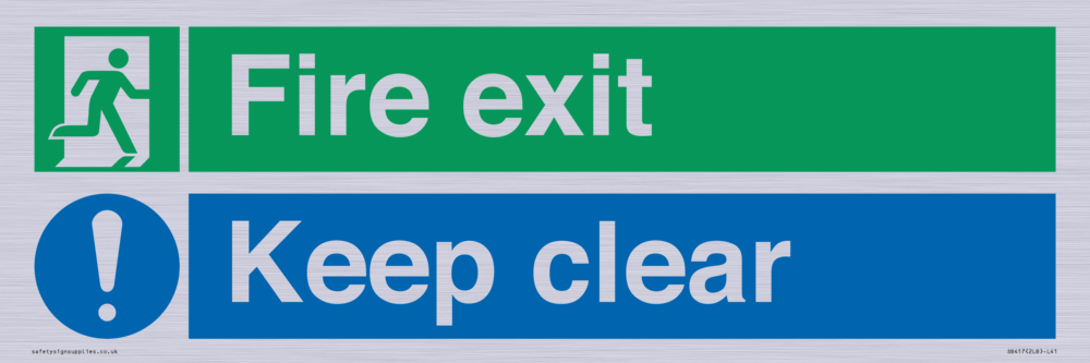 Fire Exit Keep Clear dual safety sign: running man facing right and exclamation in blue circle