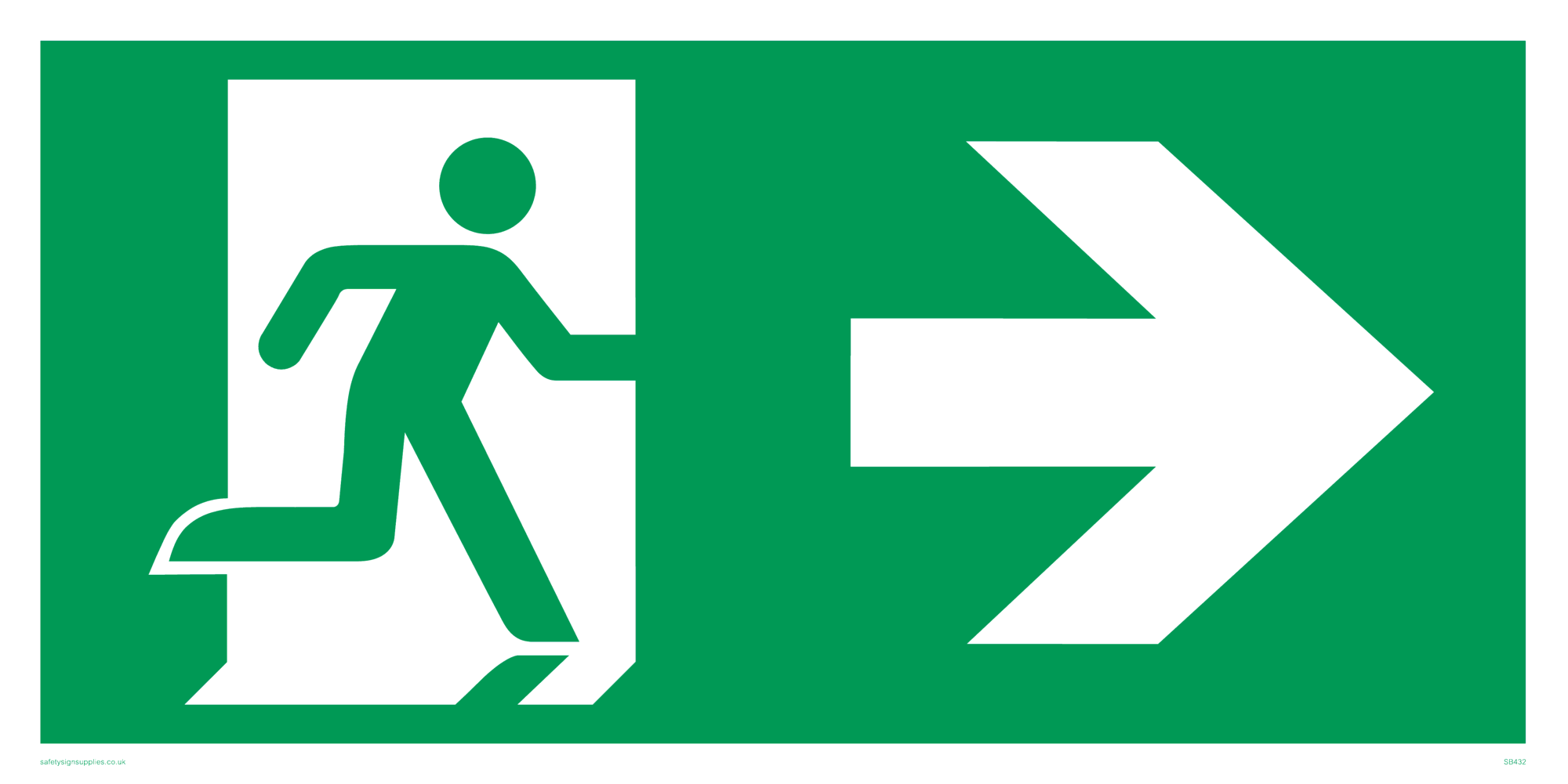 This sign contains a running man on exit facing right symbol - running person in green on exit in white.