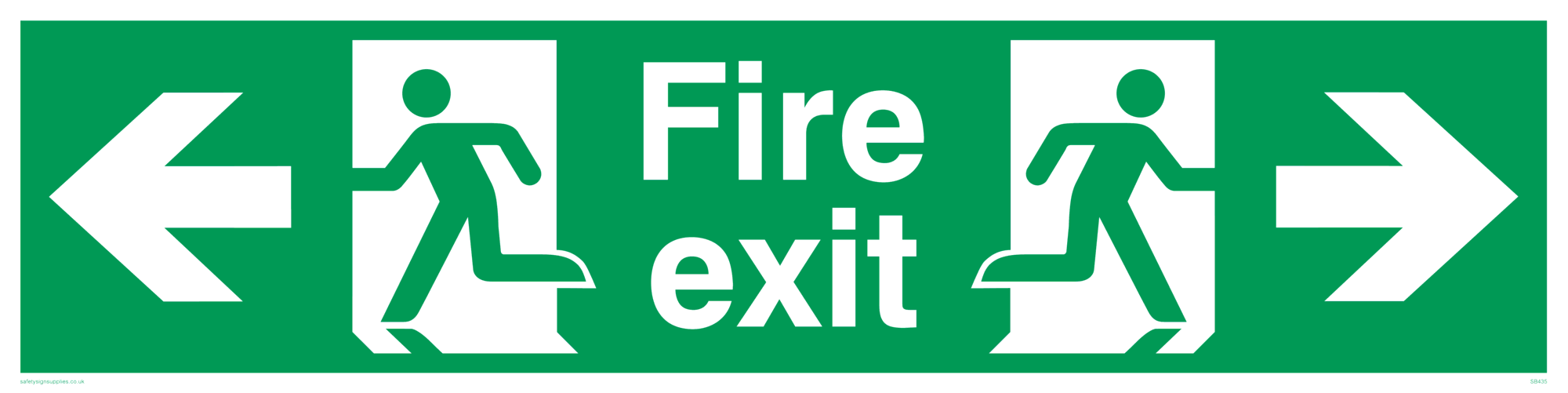 This sign contains a running man on exit facing left symbol - running person in green on exit in white. This symbol is used on BS5499 signs. This sign contains a running man on exit facing right symbol - running person in green on exit in white.