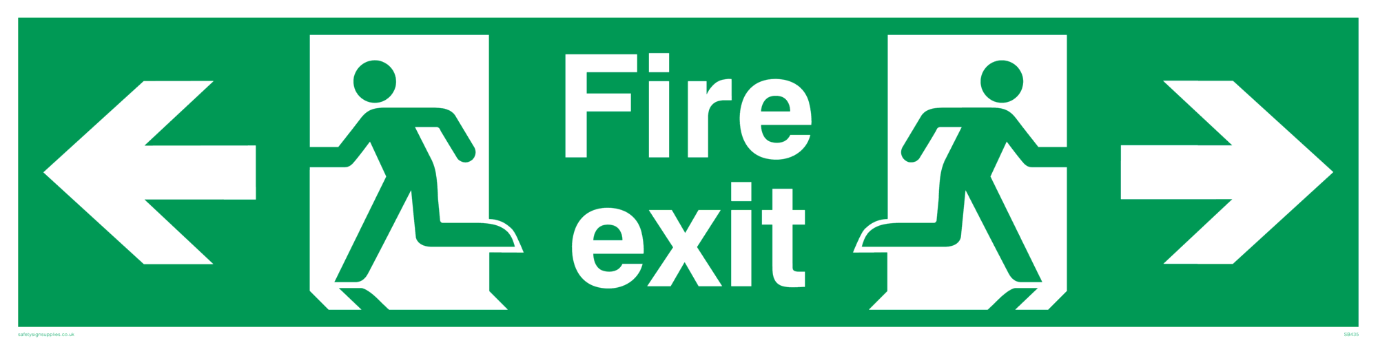 This sign contains a running man on exit facing left symbol - running person in green on exit in white. This symbol is used on BS5499 signs. This sign contains a running man on exit facing right symbol - running person in green on exit in white.