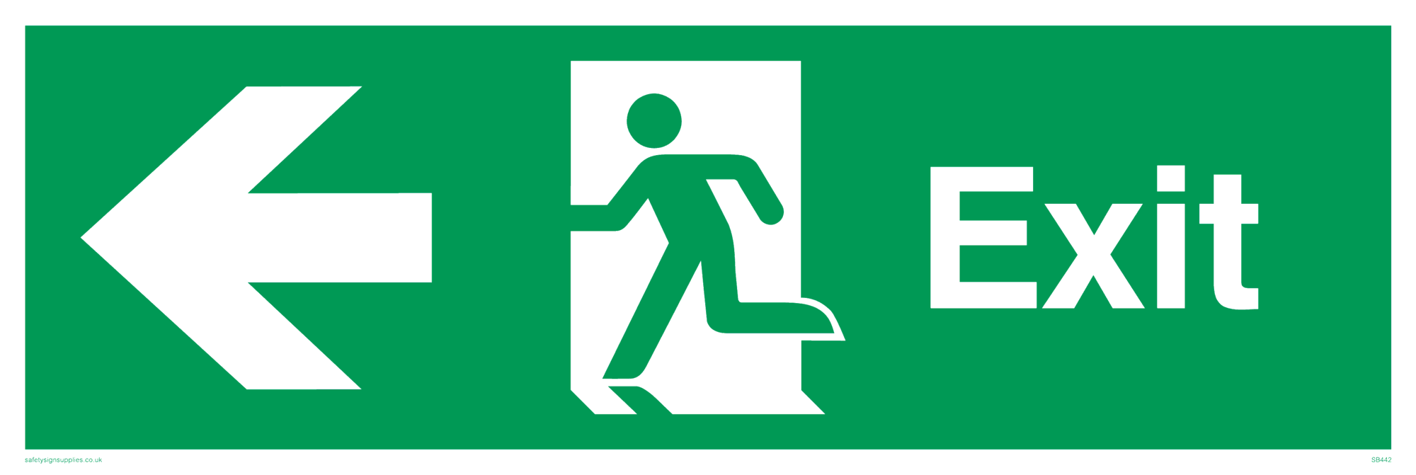 This sign contains a running man on exit facing left symbol - running person in green on exit in white. This symbol is used on BS5499 signs.