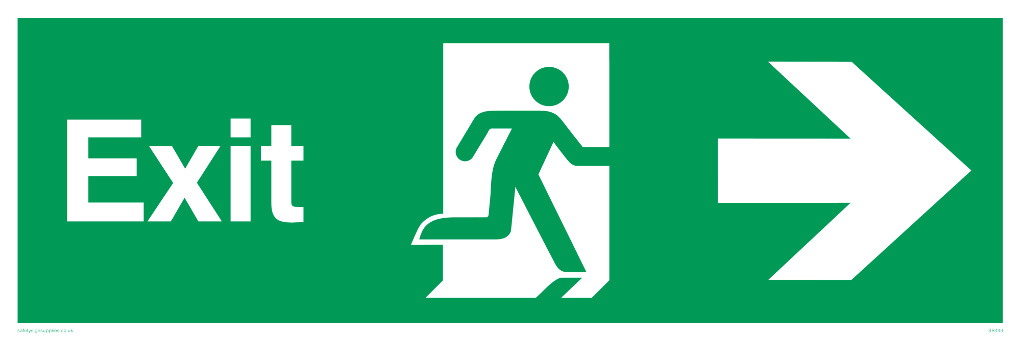 This sign contains a running man on exit facing right symbol - running person in green on exit in white.