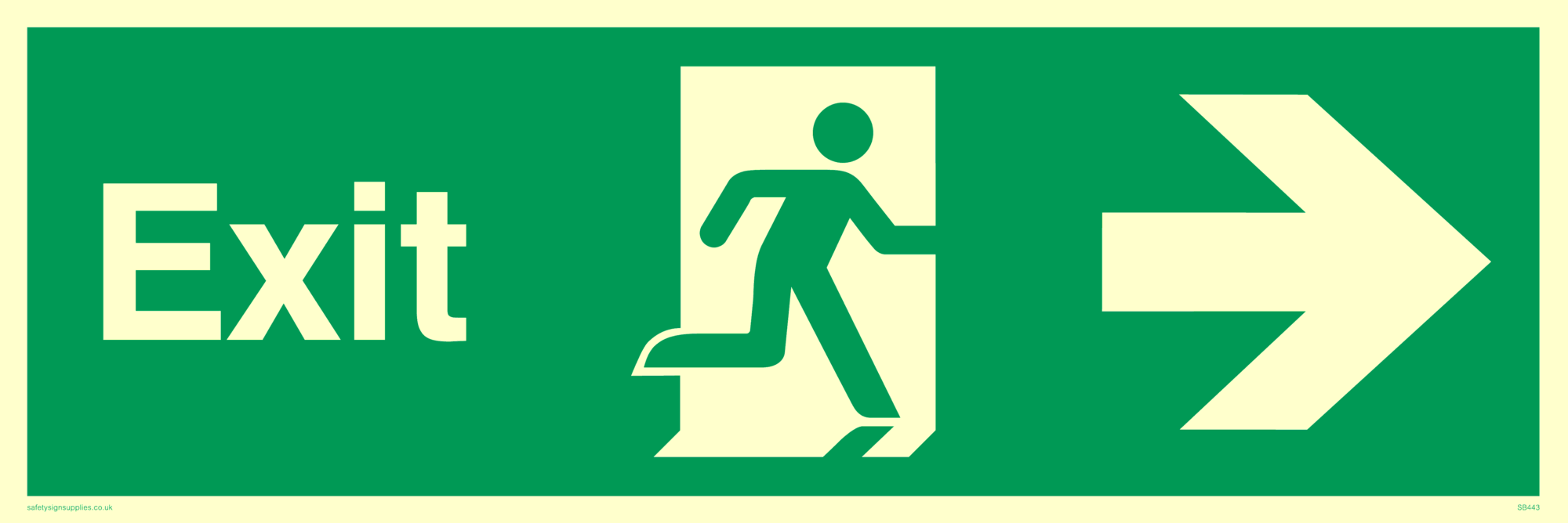 This sign contains a running man on exit facing right symbol - running person in green on exit in white.