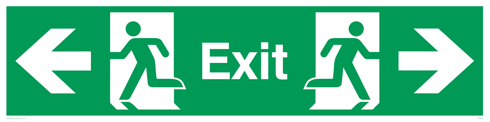This sign contains a running man on exit facing left symbol - running person in green on exit in white. This symbol is used on BS5499 signs. This sign contains a running man on exit facing right symbol - running person in green on exit in white.