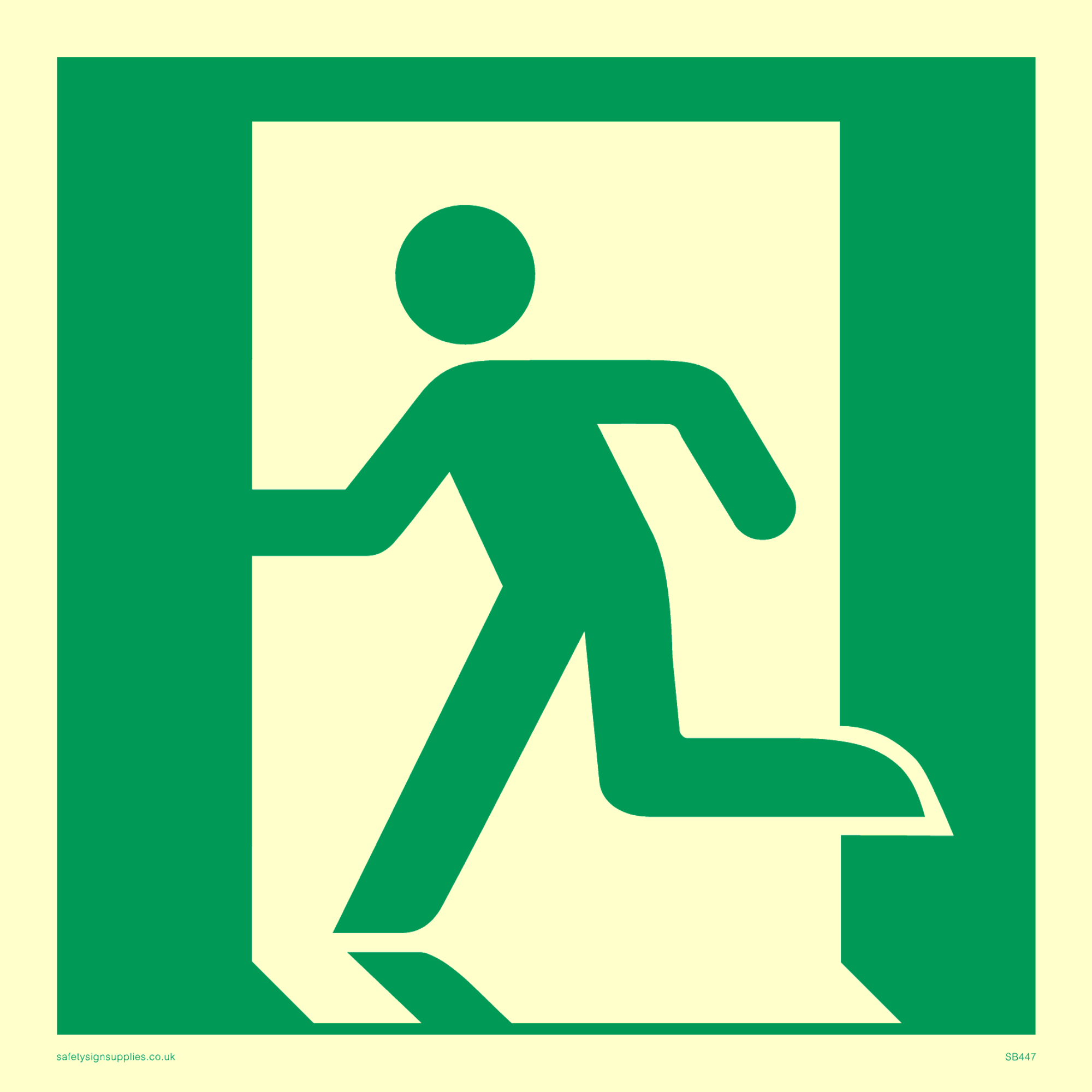 This sign contains a running man on exit facing left symbol - running person in green on exit in white. This symbol is used on BS5499 signs.