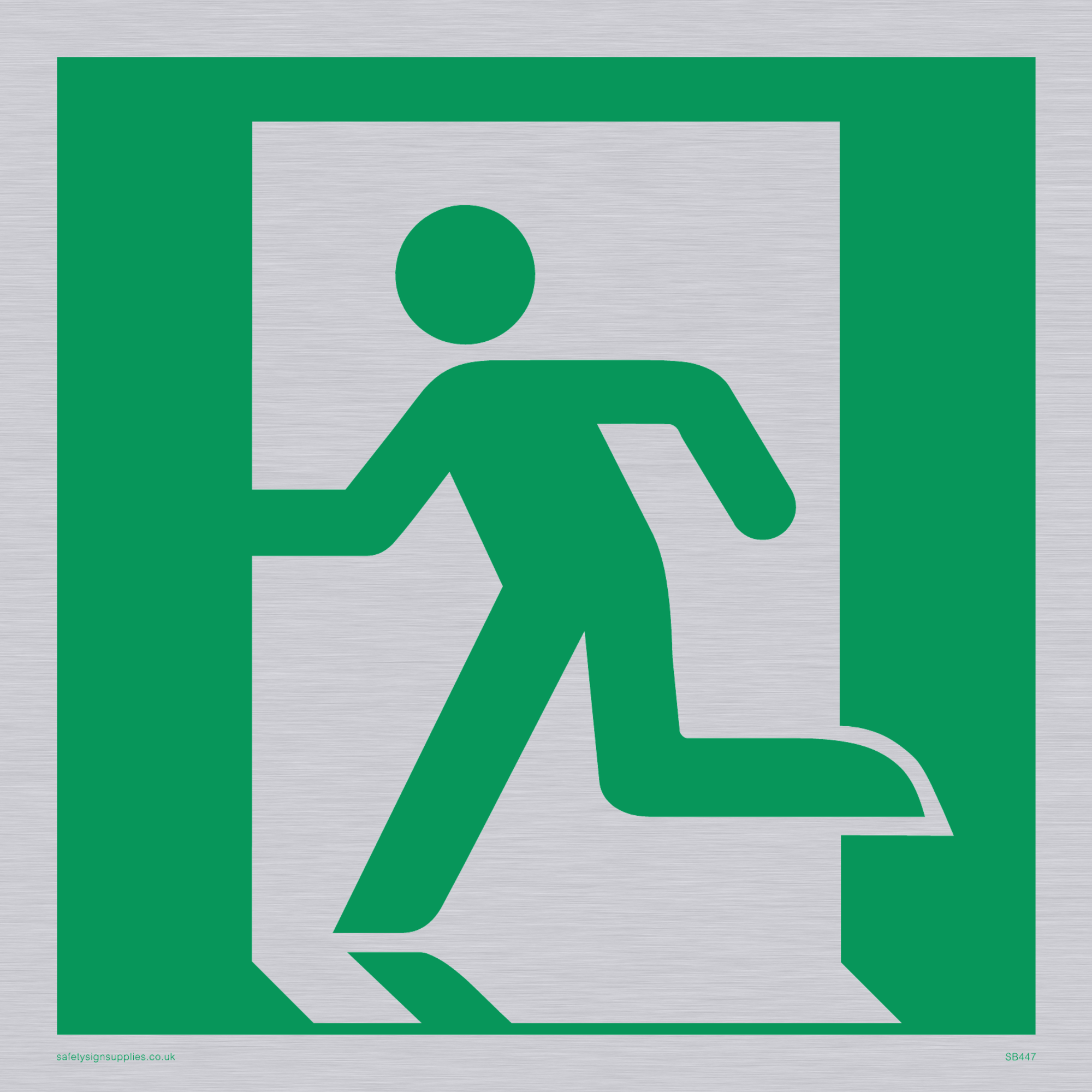 This sign contains a running man on exit facing left symbol - running person in green on exit in white. This symbol is used on BS5499 signs.