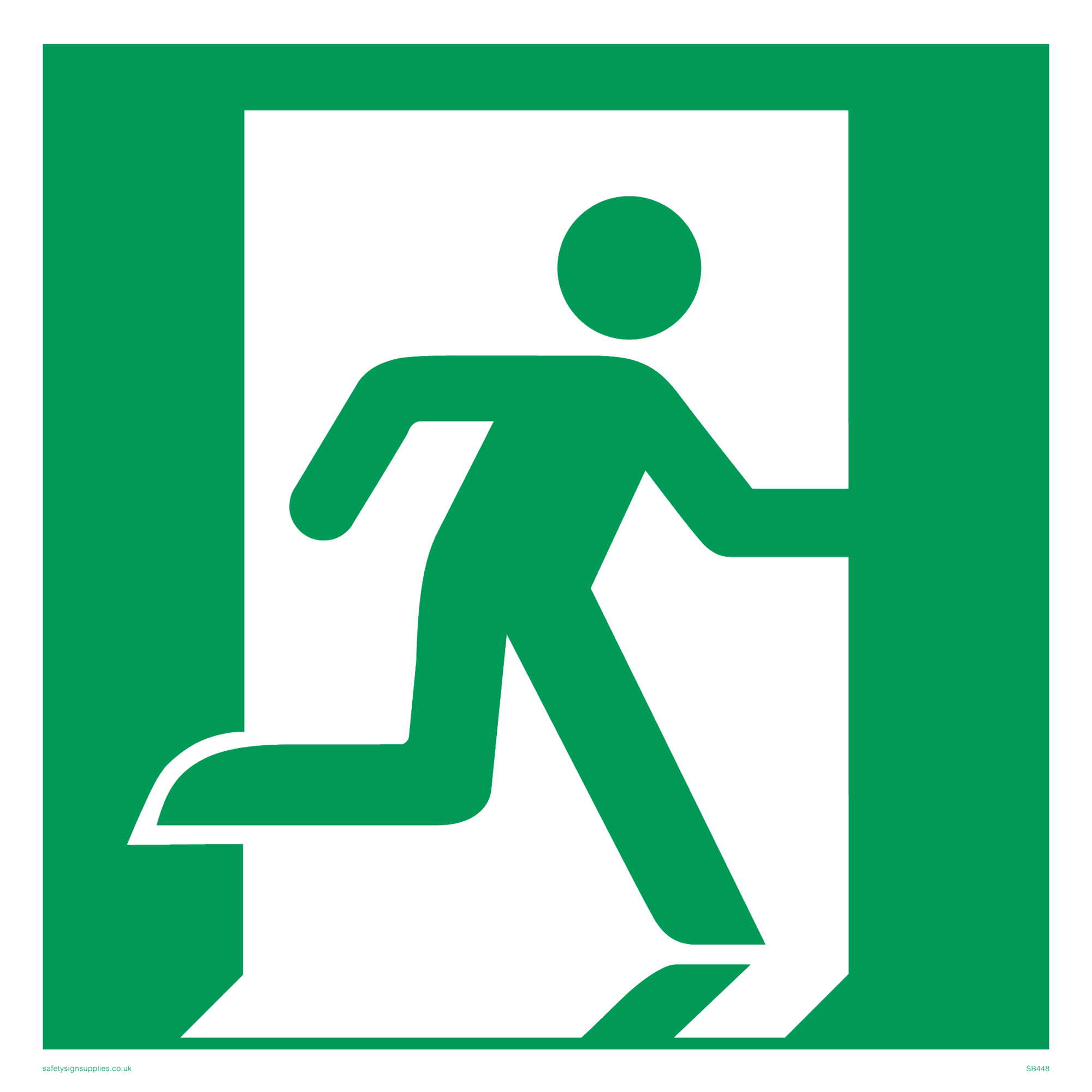 This sign contains a running man on exit facing right symbol - running person in green on exit in white.
