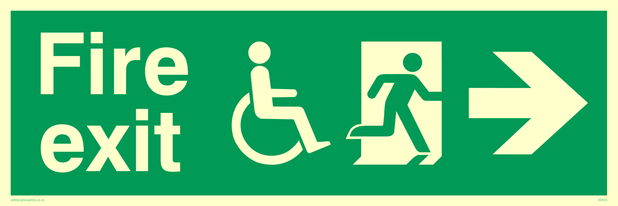 This sign contains a disabled man on exit facing right symbol - disabled person in wheelchair in green on exit in white.