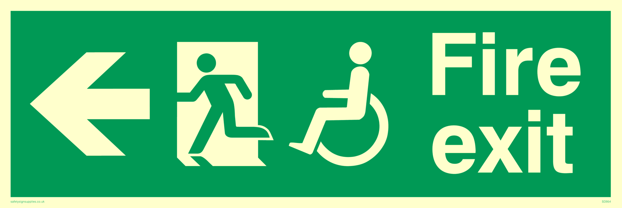 This sign contains a disabled man on exit facing left symbol - disabled person in wheelchair in green on exit in white.