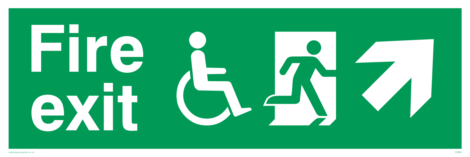 This sign contains a disabled man on exit facing right symbol - disabled person in wheelchair in green on exit in white.