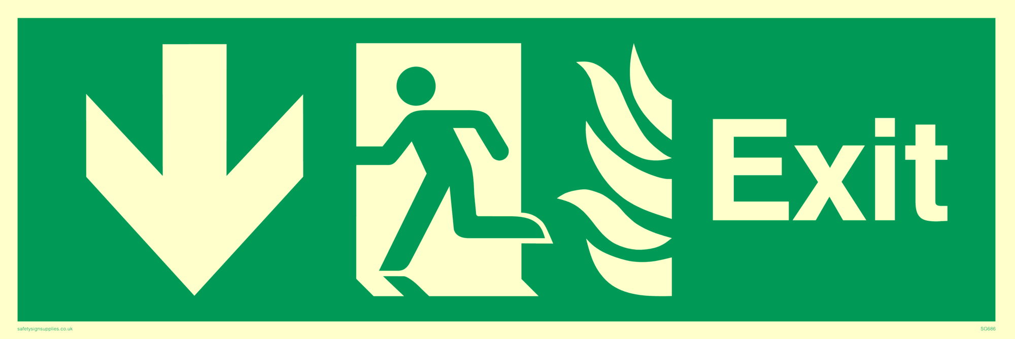 This sign contains a running man on exit facing left symbol - running person in green on exit in white. This symbol is used on BS5499 signs.