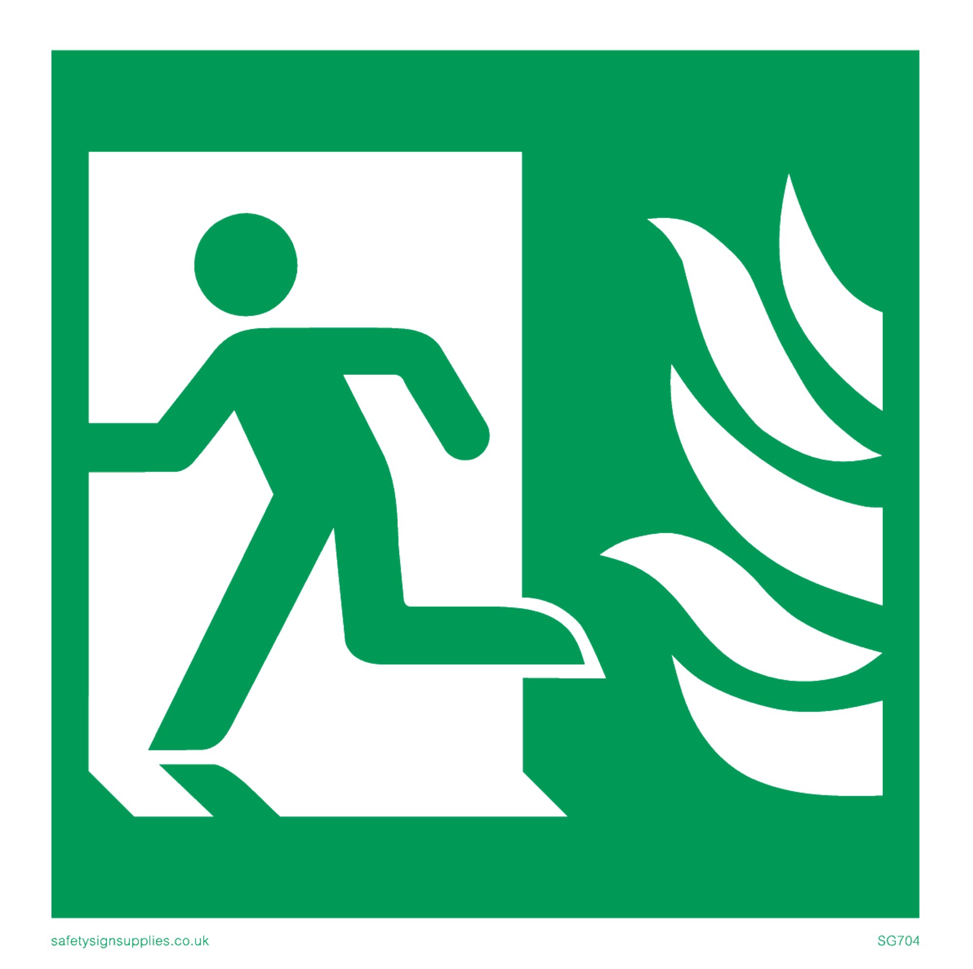 This sign contains a running man on exit facing left symbol - running person in green on exit in white. This symbol is used on BS5499 signs.
