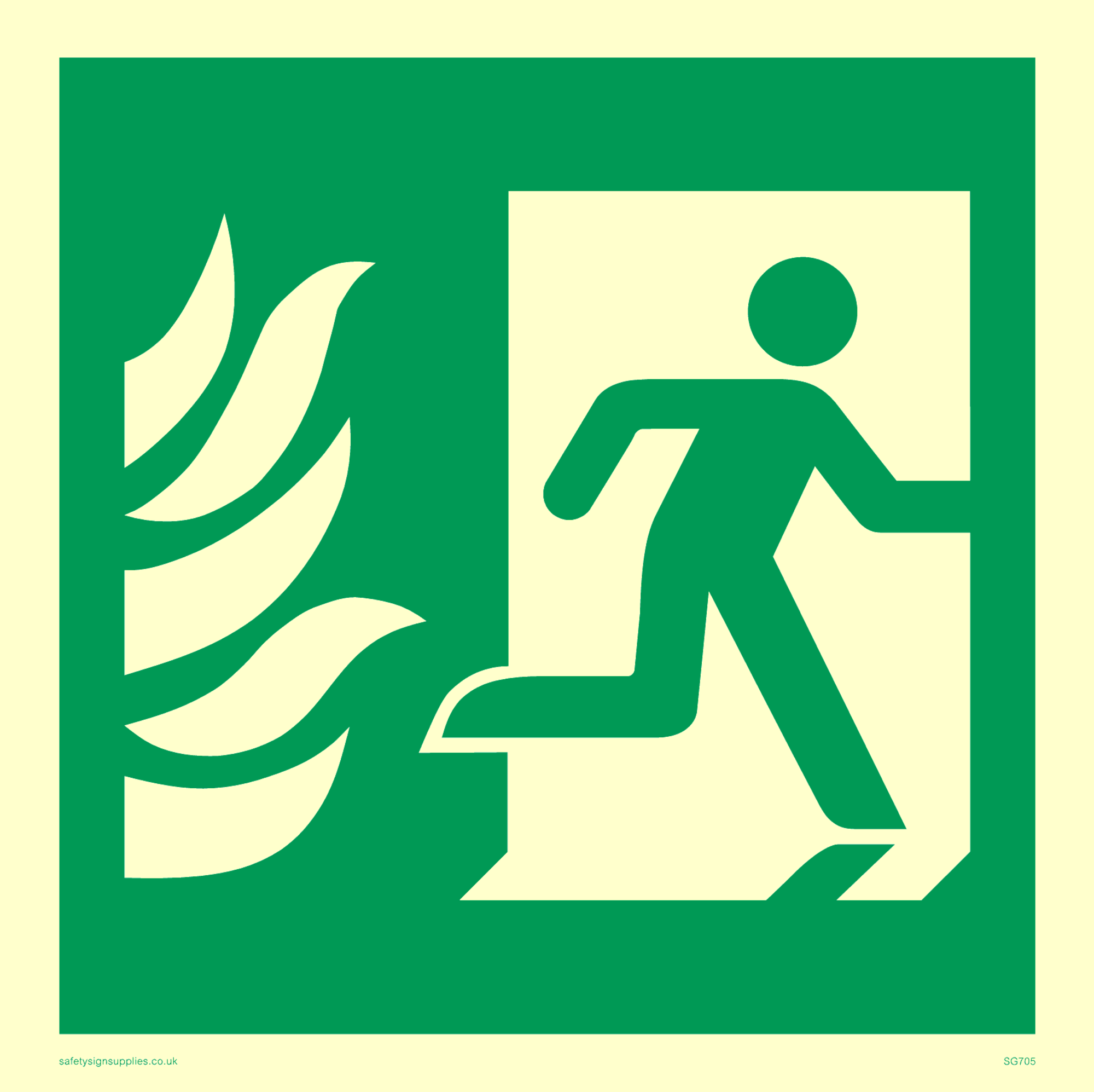 This sign contains a running man on exit facing right symbol - running person in green on exit in white.