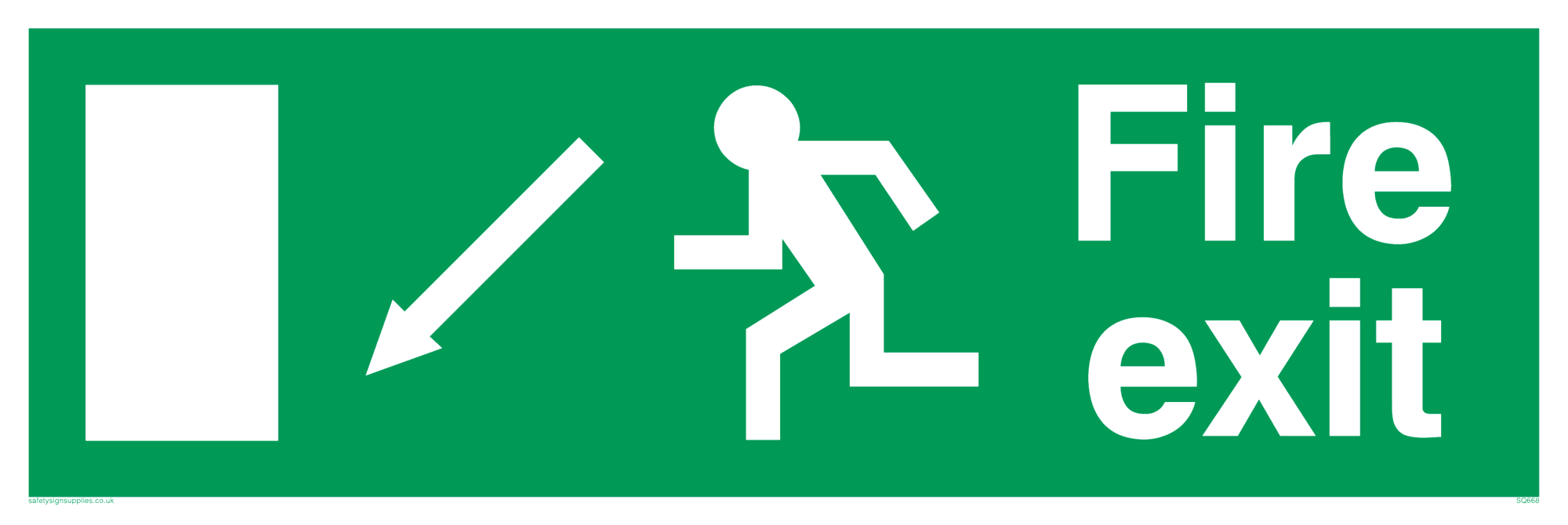 This sign contains a man running left symbol - man running left in white on green background. This symbol is used on 92/58 EC (European standard) signs.