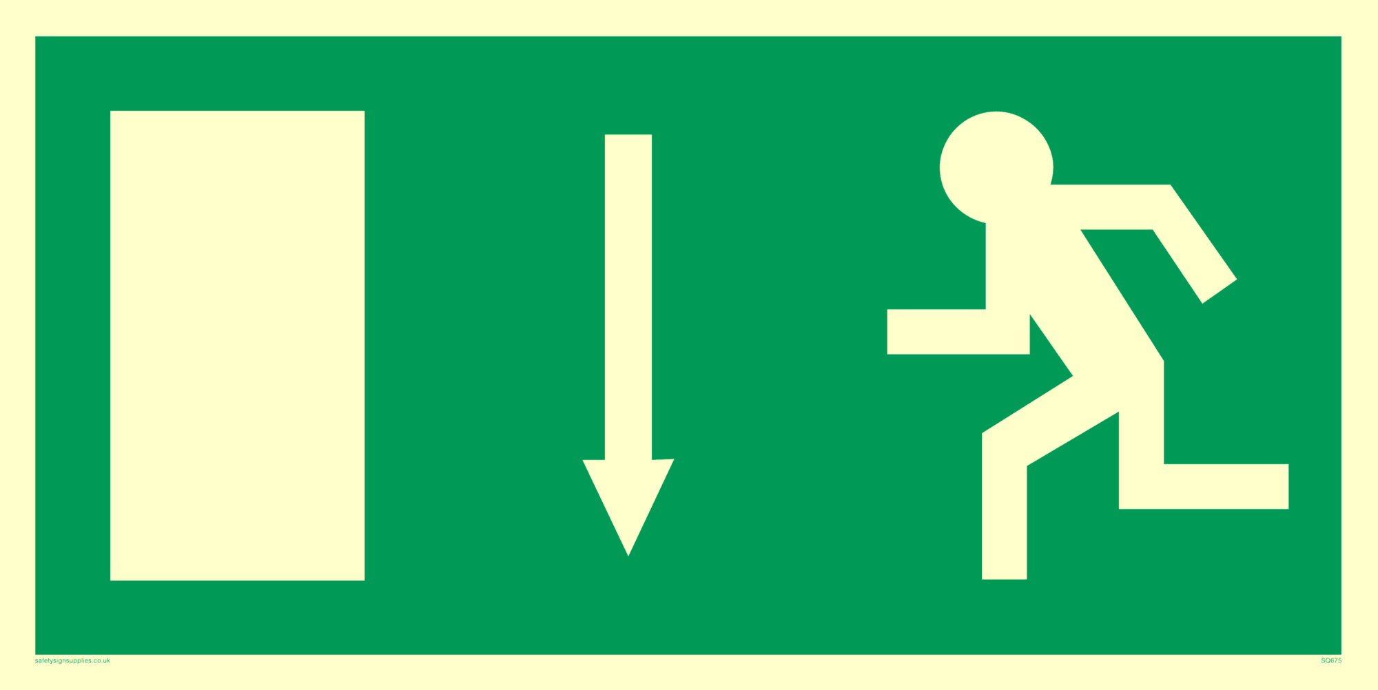 This sign contains a man running left symbol - man running left in white on green background. This symbol is used on 92/58 EC (European standard) signs.