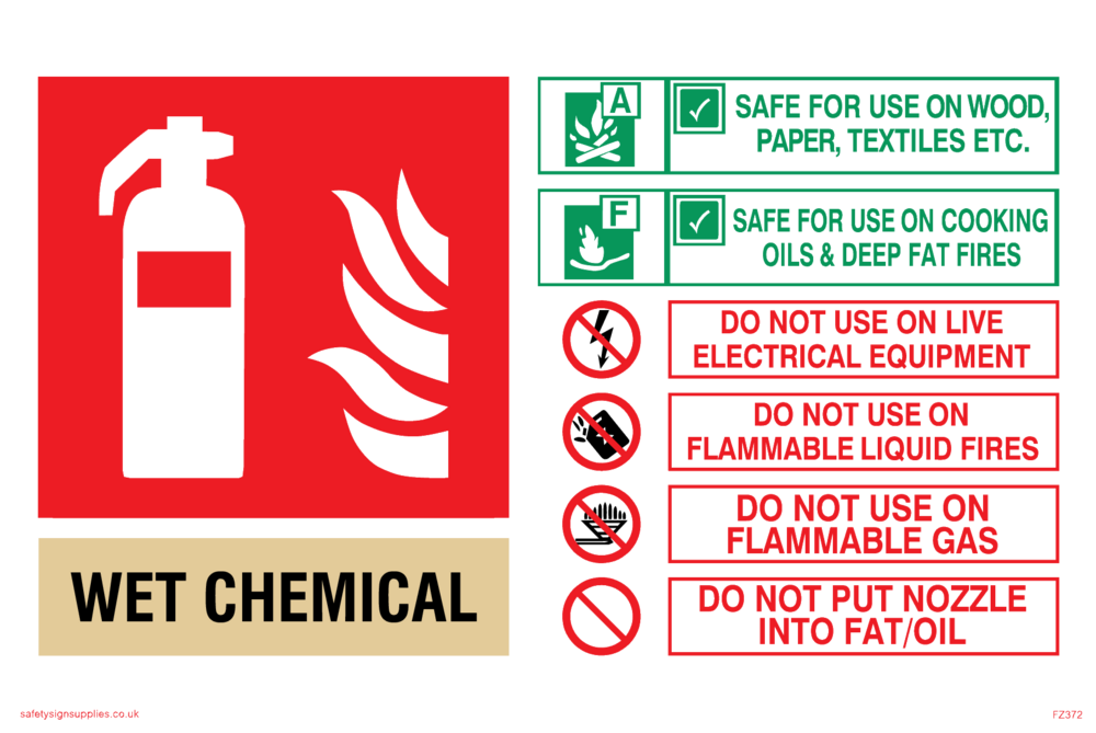 Sign Text: WET CHEMICAL SAFE FOR USE ON WOOD, PAPER, TEXTILES, ETC. SAFE FOR USE ON COOKING OILS & DEEP FAT FIRES. DO NOT USE ON LIVE ELECTRICAL EQUIPMENT DO NOT USE ON FLAMMABLE LIQUID FIRES DO NOT USE ON FLAMMABLE GAS DO NOT PUT NOZZLE INTO FAT/OIL