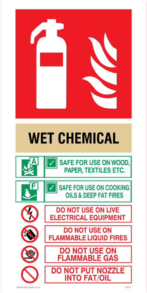 This sign contains a safe for safe for wood and paper fires symbol. Burning wood with flames in white on green background with letter A. This sign contains a general Safe Condition Symbol - white tick on green background.