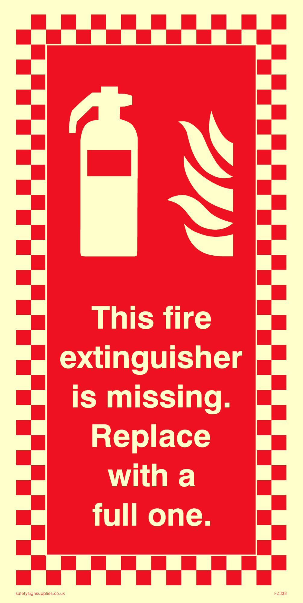 This sign contains a fire extinguisher symbol - outline of a fire extinguisher in white on red background.
