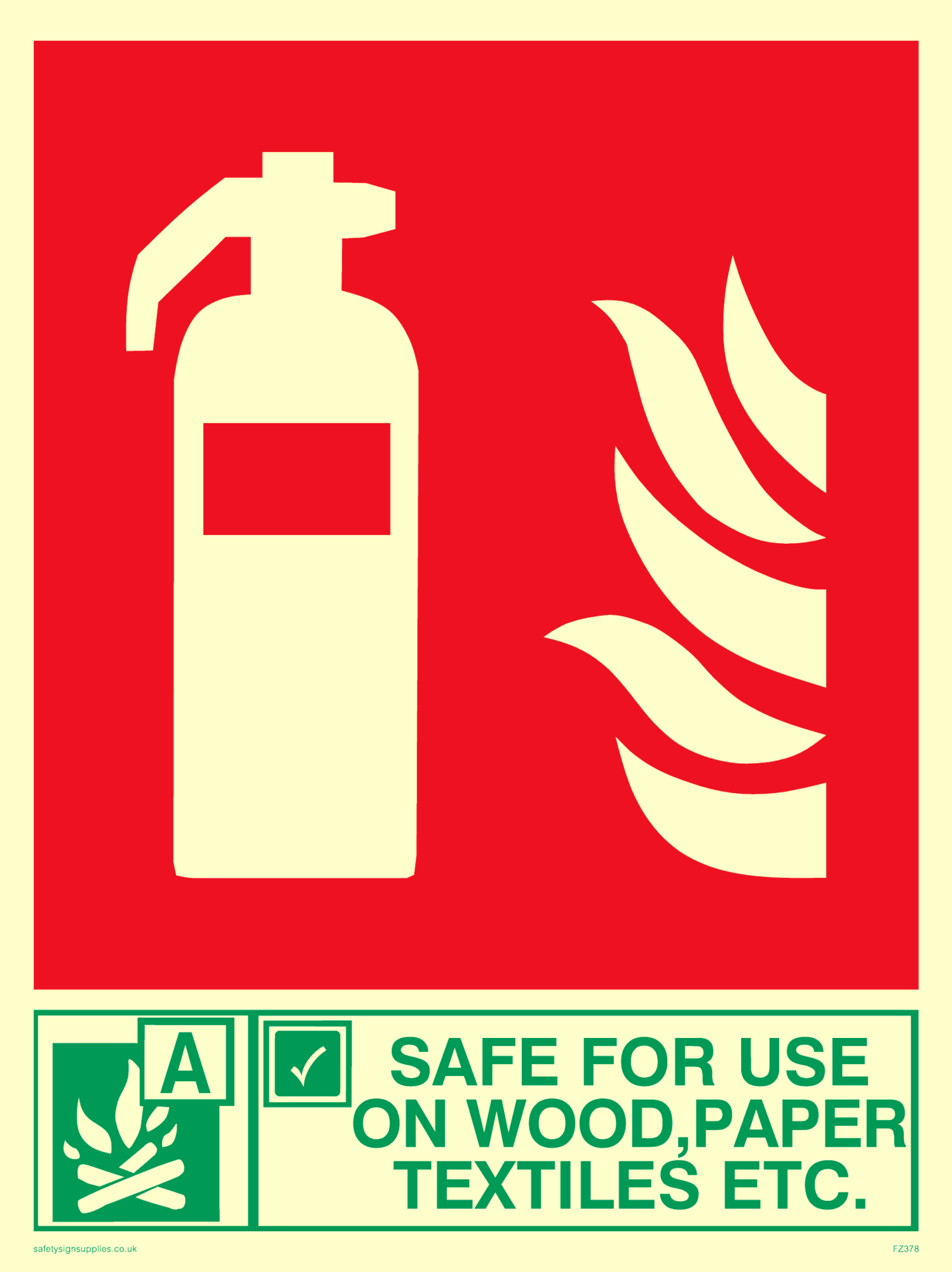 This sign contains a safe for safe for wood and paper fires symbol. Burning wood with flames in white on green background with letter A. This sign contains a general Safe Condition Symbol - white tick on green background.