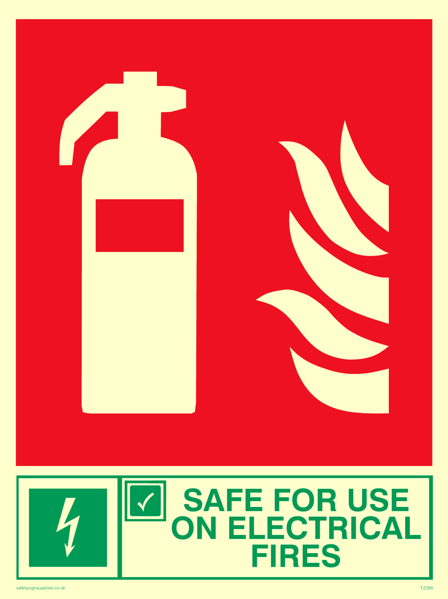 This sign contains a safe for safe for electrical fires symbol. electrical lightning symbol in white on green background.