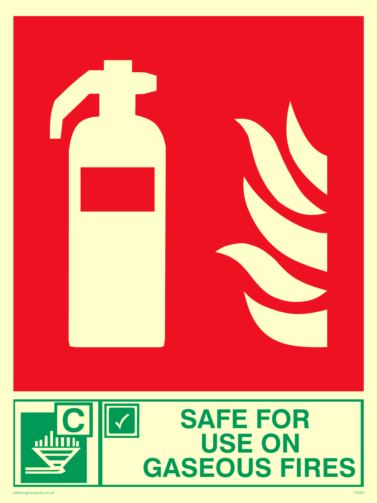 This sign contains a safe for safe for gaseous fires symbol. Burning gas in white on green background with letter C.
