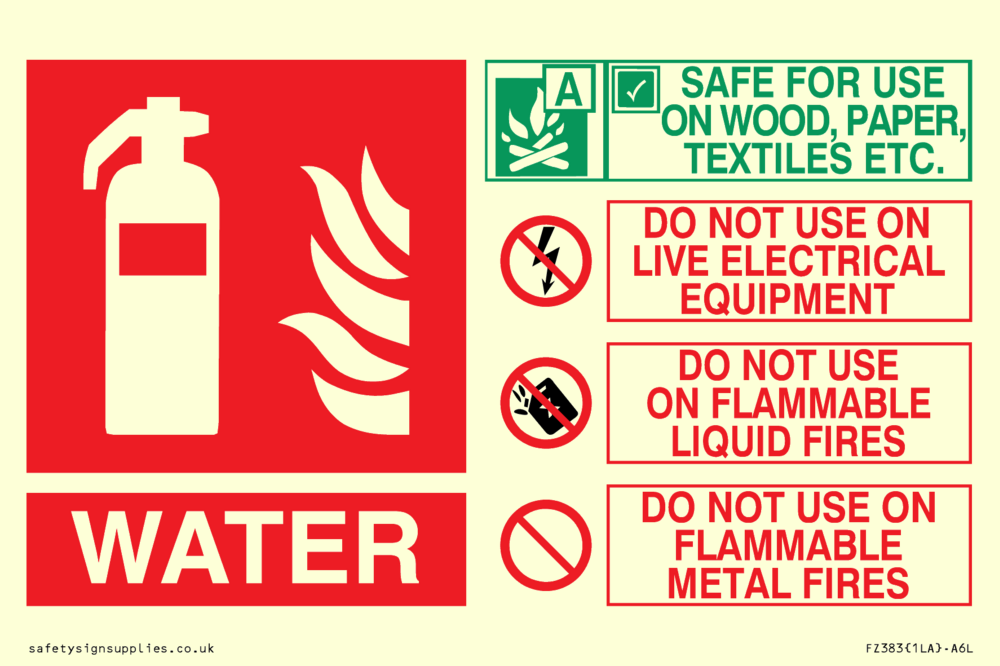 Sign Text: WATER SAFE FOR USE ON WOOD, PAPER, TEXTILES, ETC DO NOT USE ON LIVE ELECTRICAL EQUIPMENT DO NOT USE ON FLAMMABLE LIQUID FIRES DO NOT USE ON FLAMMABLE METAL FIRES