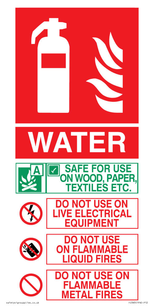 Sign Text: WATER SAFE FOR USE ON WOOD, PAPER, TEXTILES, ETC DO NOT USE ON LIVE ELECTRICAL EQUIPMENT DO NOT USE ON FLAMMABLE LIQUID FIRES DO NOT USE ON FLAMMABLE METAL FIRES