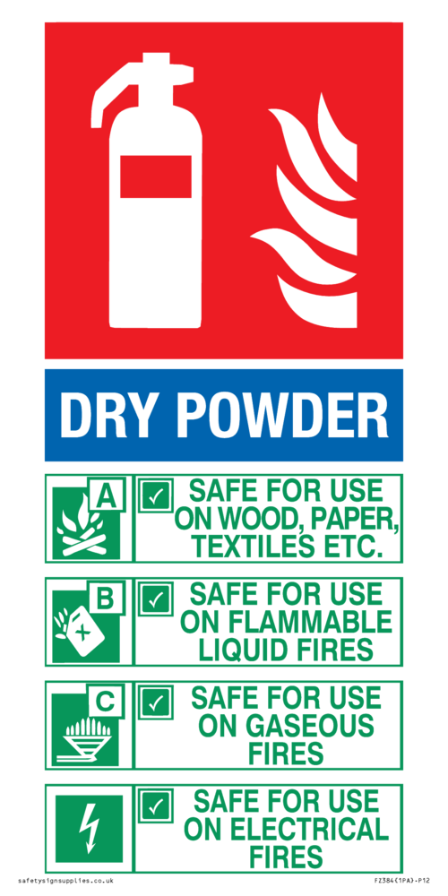Sign Text: DRY POWDER SAFE FOR USE ON WOOD, PAPER, TEXTILES, ETC SAFE FOR USE ON FLAMMABLE LIQUID FIRES SAFE FOR USE ON GASEOUS FIRES SAFE FOR USE ON ELECTRICAL FIRES