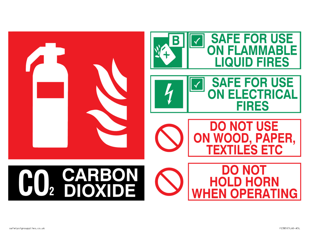 Sign Text: CO2 SAFE FOR USE ON FLAMMABLE LIQUID FIRES SAFE FOR USE ON ELECTRICAL FIRES DO NOT USE ON WOOD, PAPER, TEXTILES, ETC DO NOT HOLD HORN WHEN OPERATING