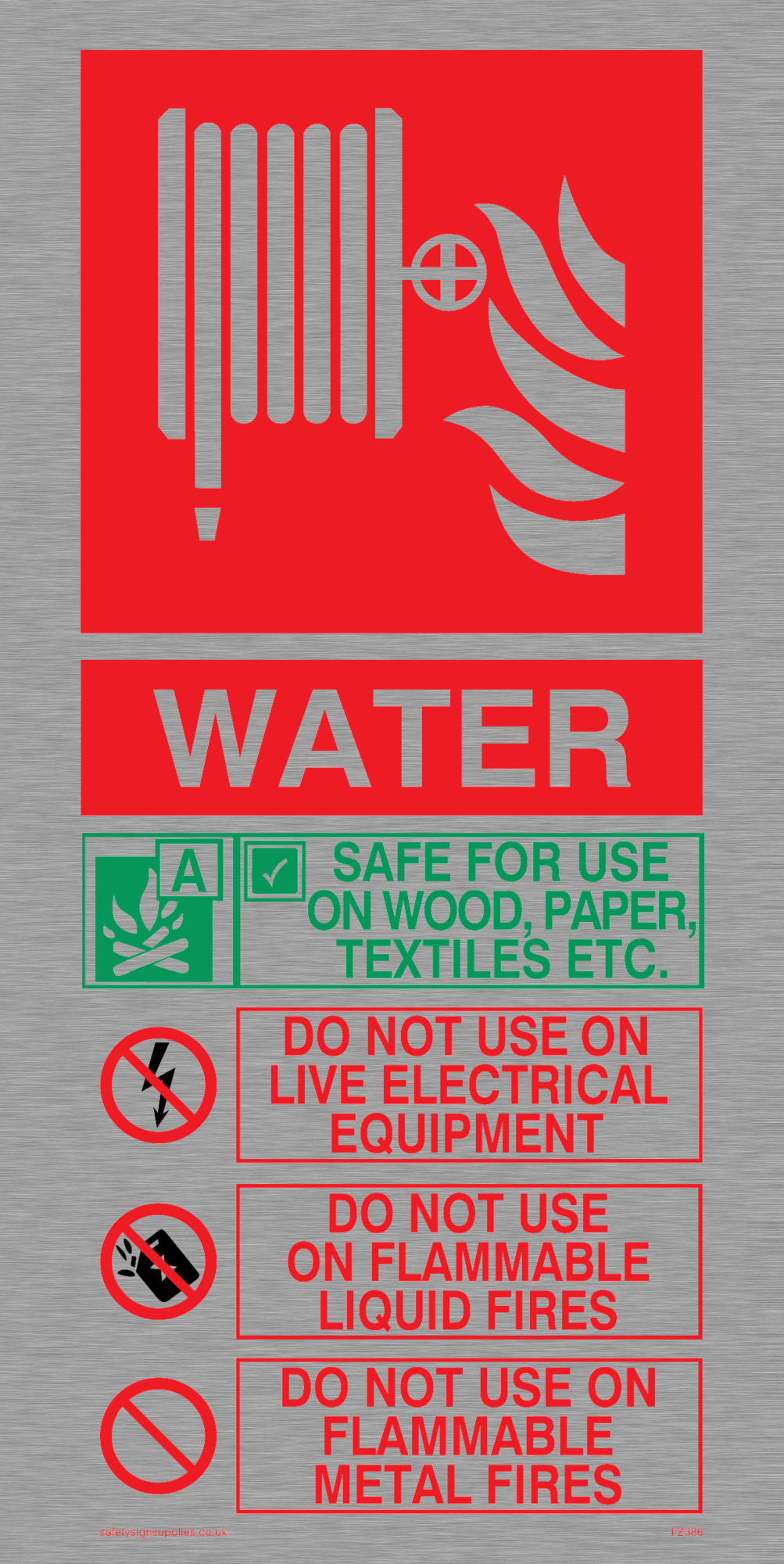 This sign contains a do not use on live electrical fires symbol. Electrical lighting flash in black contained in red circle crossed through.
