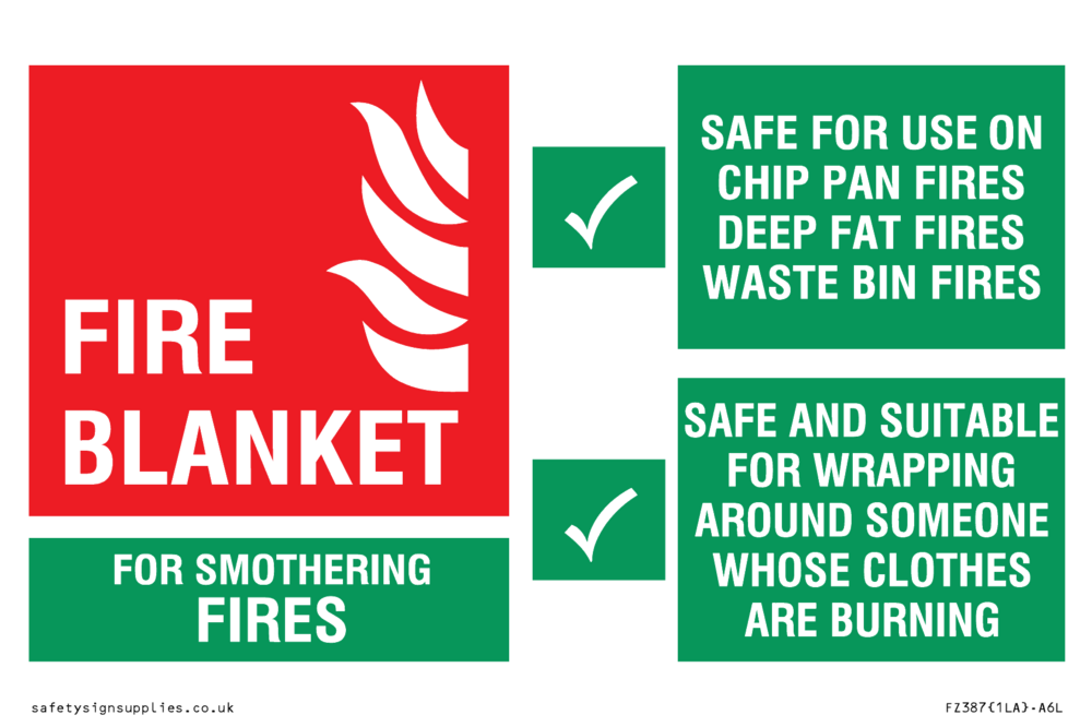 Sign Text: Fire blanket sign for mothering fires safety for use on chip pan fires, deep fat fires, waste bin fires. Safe and suitable for wrapping around someone whose clothes are burning.