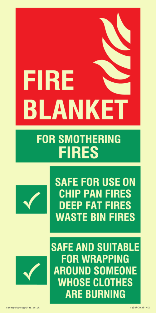 Sign Text: Fire blanket sign for mothering fires safety for use on chip pan fires, deep fat fires, waste bin fires. Safe and suitable for wrapping around someone whose clothes are burning.