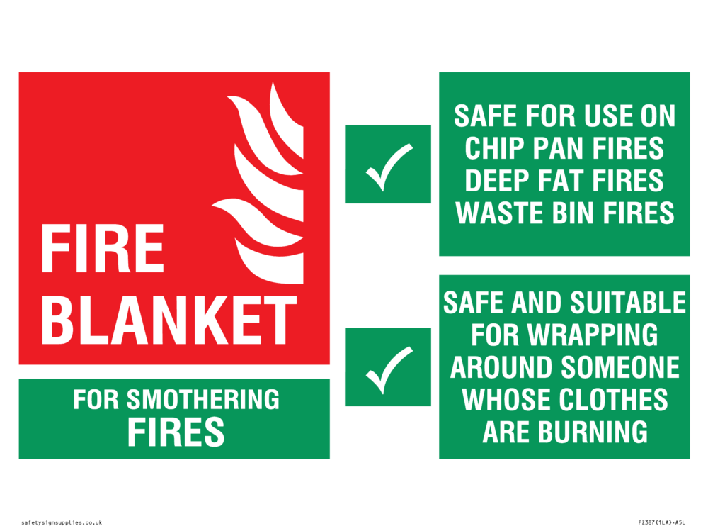 Sign Text: Fire blanket sign for mothering fires safety for use on chip pan fires, deep fat fires, waste bin fires. Safe and suitable for wrapping around someone whose clothes are burning.