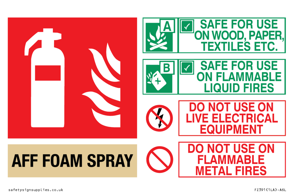 Sign Text: AFF FOAM SPRAY (AFFF) SAFE FOR USE ON WOOD, PAPER, TEXTILES, ETC. SAFE FOR USE ON FLAMMABLE LIQUID FIRES DO NOT USE ON LIVE ELECTRICAL EQUIPMENT DO NOT USE ON FLAMMABLE METAL FIRES