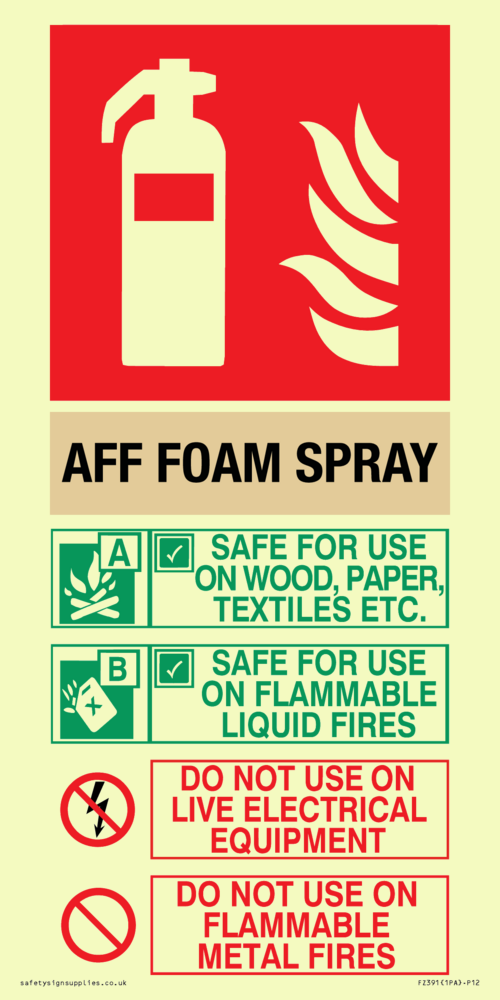 Sign Text: AFF FOAM SPRAY (AFFF) SAFE FOR USE ON WOOD, PAPER, TEXTILES, ETC. SAFE FOR USE ON FLAMMABLE LIQUID FIRES DO NOT USE ON LIVE ELECTRICAL EQUIPMENT DO NOT USE ON FLAMMABLE METAL FIRES