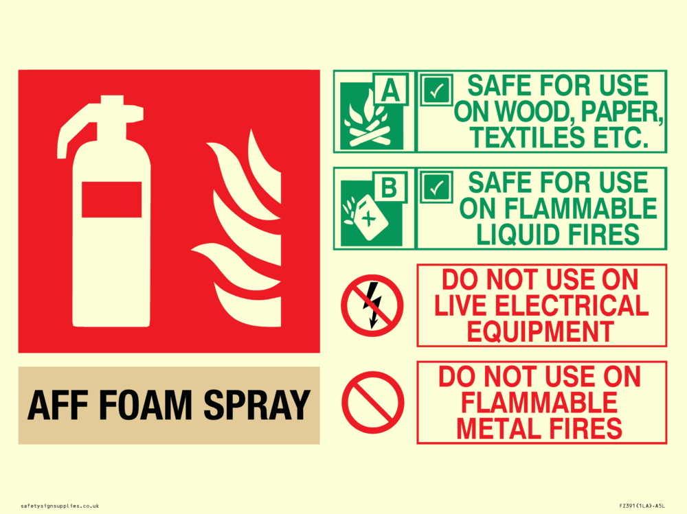 Sign Text: AFF FOAM SPRAY (AFFF) SAFE FOR USE ON WOOD, PAPER, TEXTILES, ETC. SAFE FOR USE ON FLAMMABLE LIQUID FIRES DO NOT USE ON LIVE ELECTRICAL EQUIPMENT DO NOT USE ON FLAMMABLE METAL FIRES