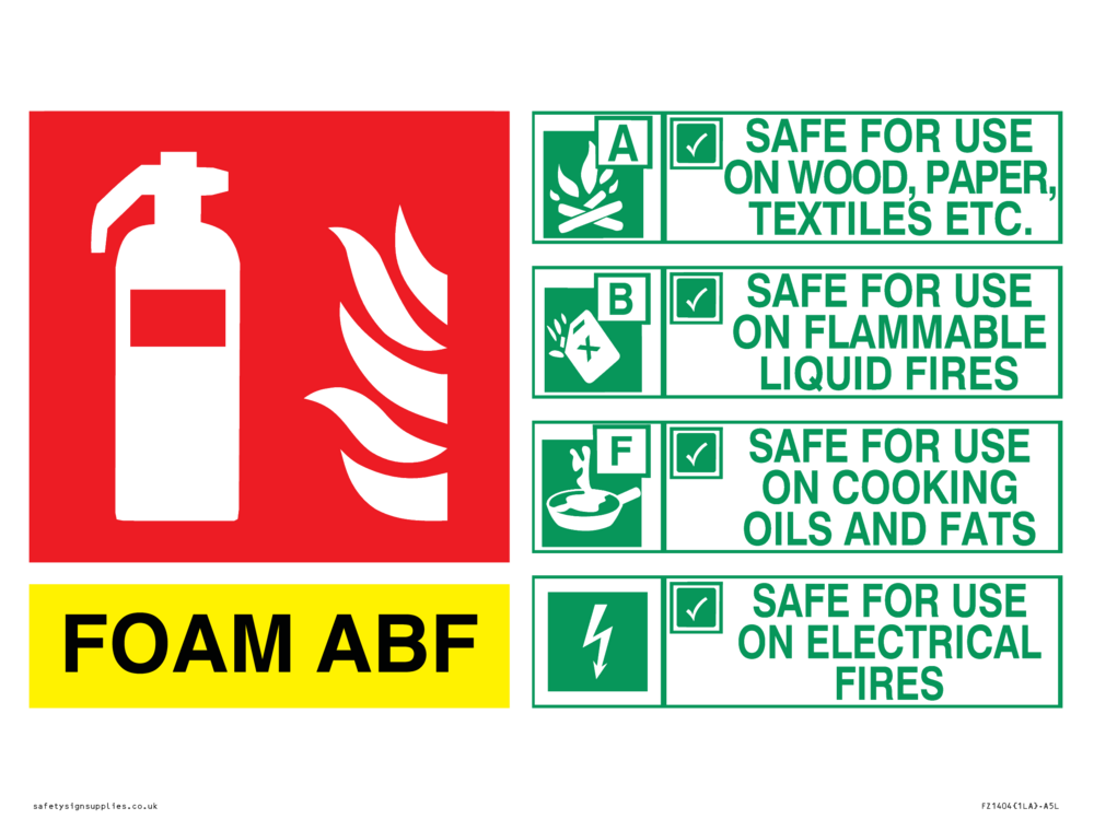 Sign Text: FOAM SAFE FOR USE ON WOOD, PAPER, TEXTILES, FLAMMABLE LIQUIDS, COOKING OILS AND FATS AND ELECTRICAL FIRES