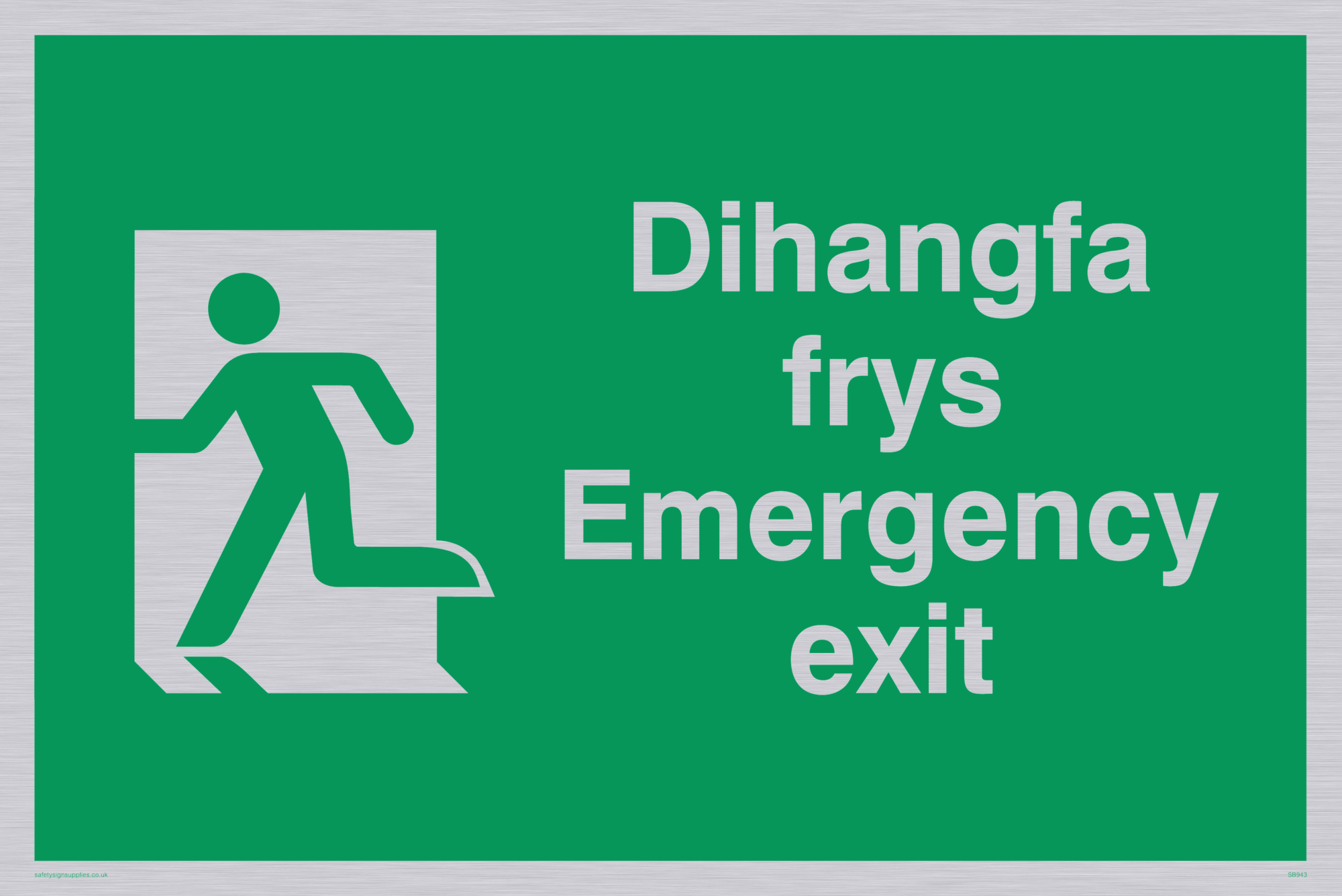 This sign contains a running man on exit facing left symbol - running person in green on exit in white. This symbol is used on BS5499 signs.