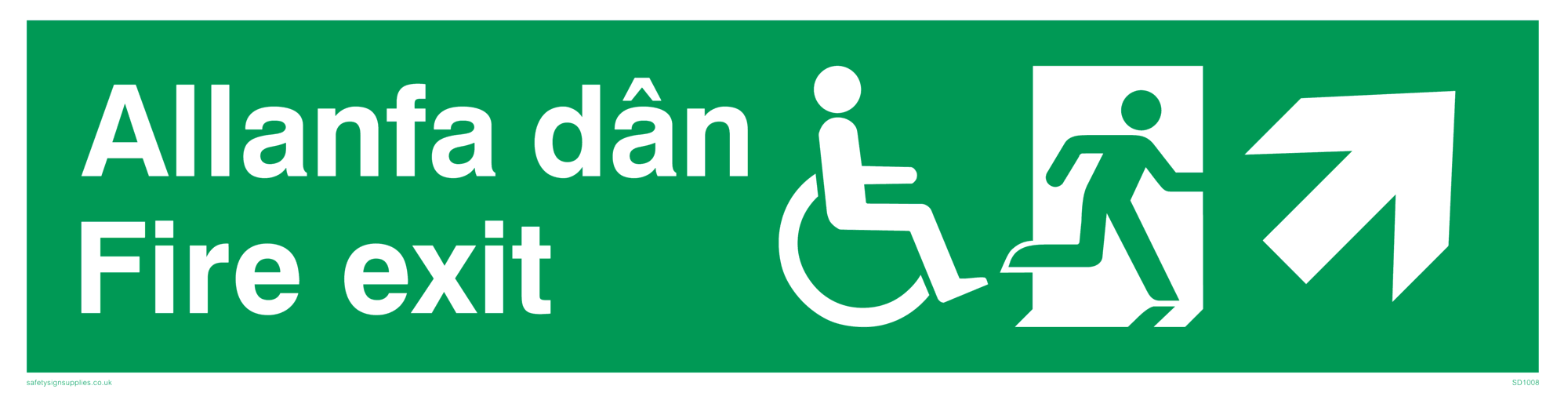 Fire exit signs or Emergency exit signs indicate the direction of the exit in the event of a fire or emergency requiring evacuation of a building. Disability signs are used to indicate access or special provisions for disabled people. Bi-lingual English / Welsh signs contain text in both English and Welsh. This sign is large. Signs in this range are from our maximum choice range. Giving you the most choice of signs available in the UK.
