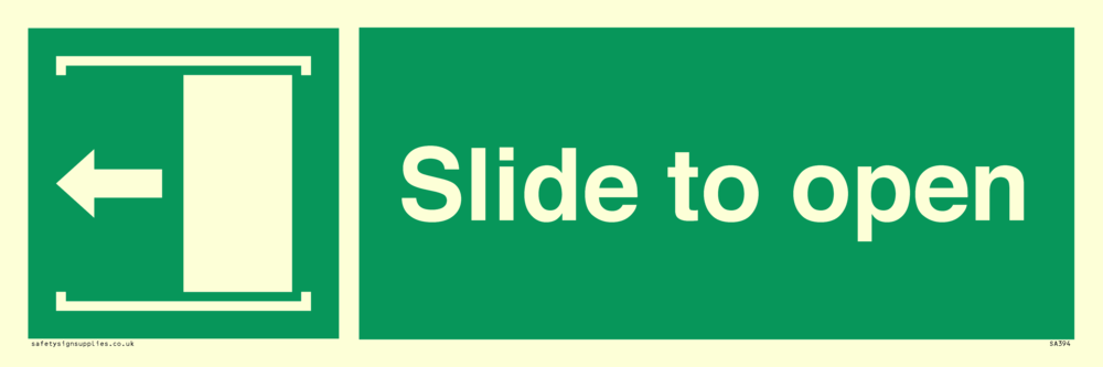 This sign contains a slide to open symbol - door in frame with arrow to one side in white on green background. Comes with a self adhesive backing.