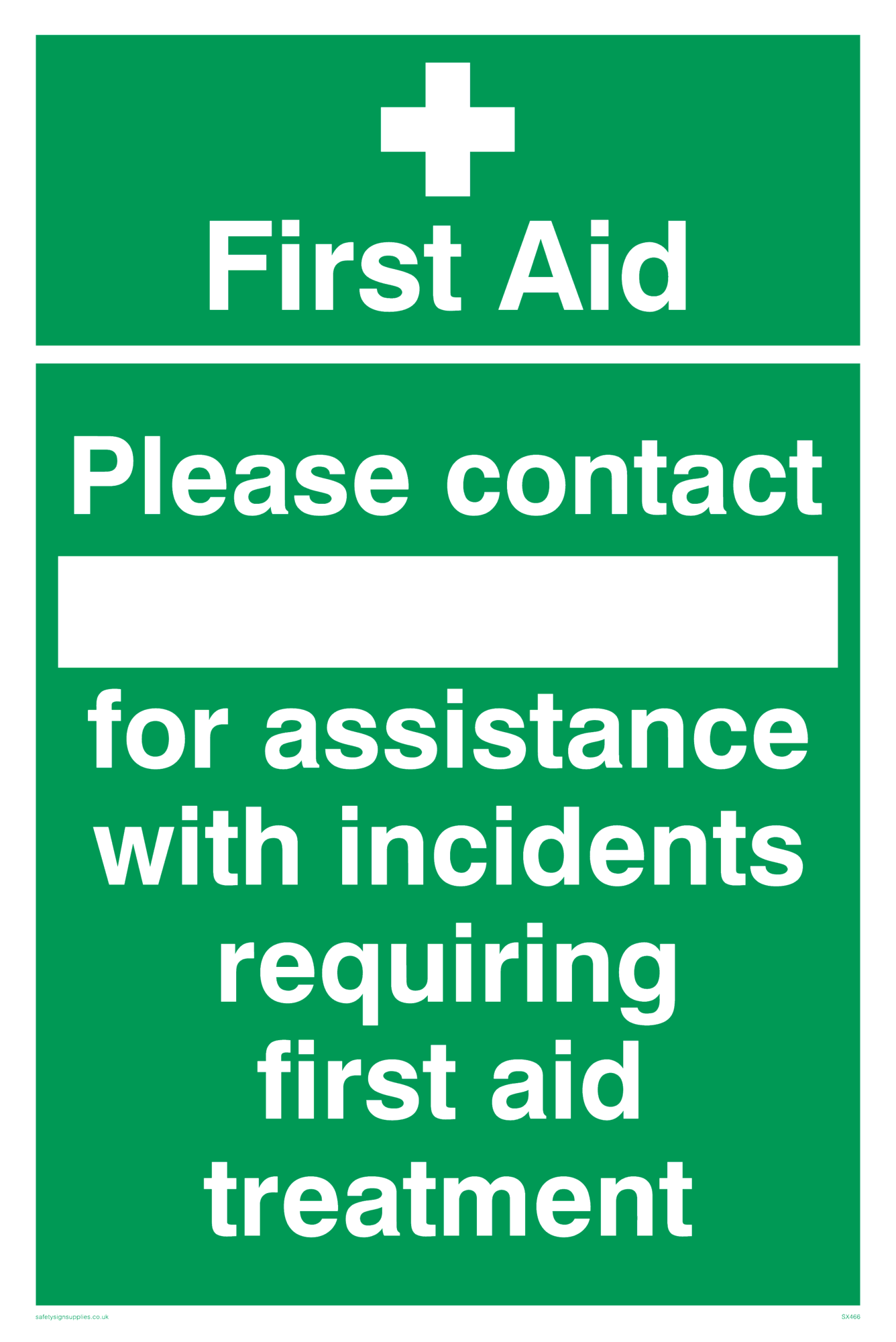 This sign contains a first aid symbol - universal first aid cross in white on green background.