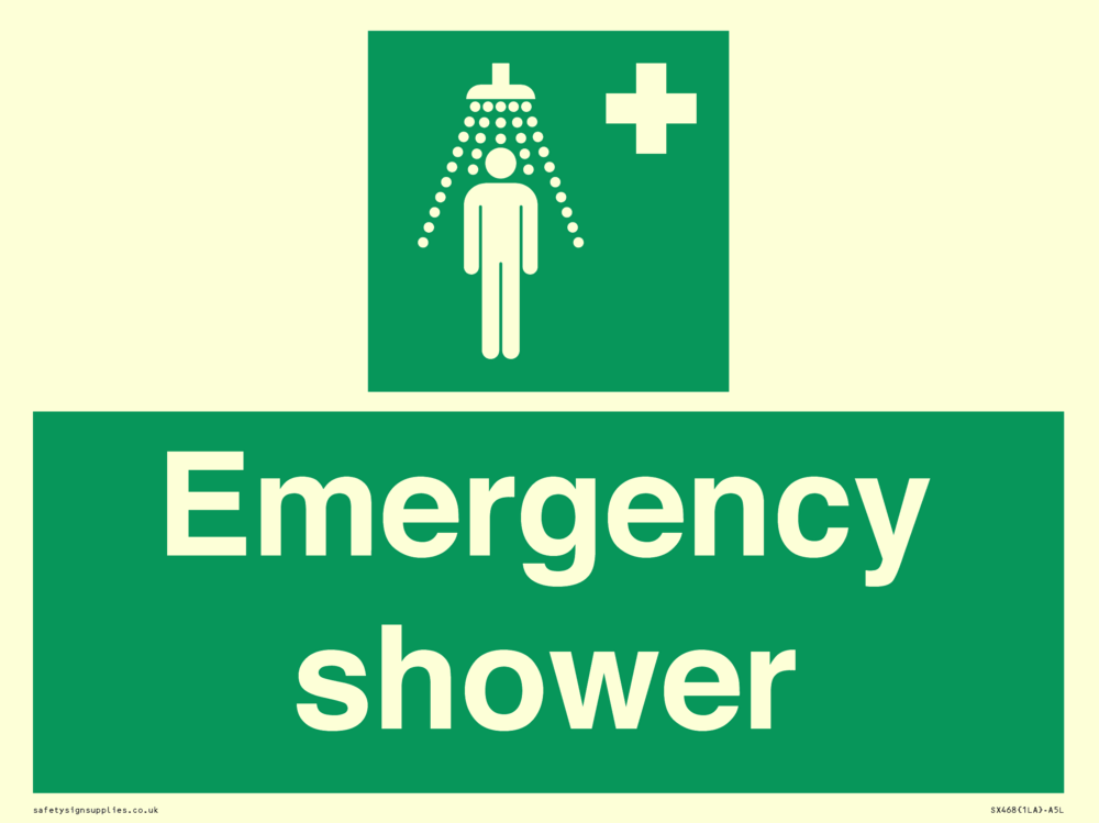 Image content: Human figure under running water coming out of a shower head, first aid cross.