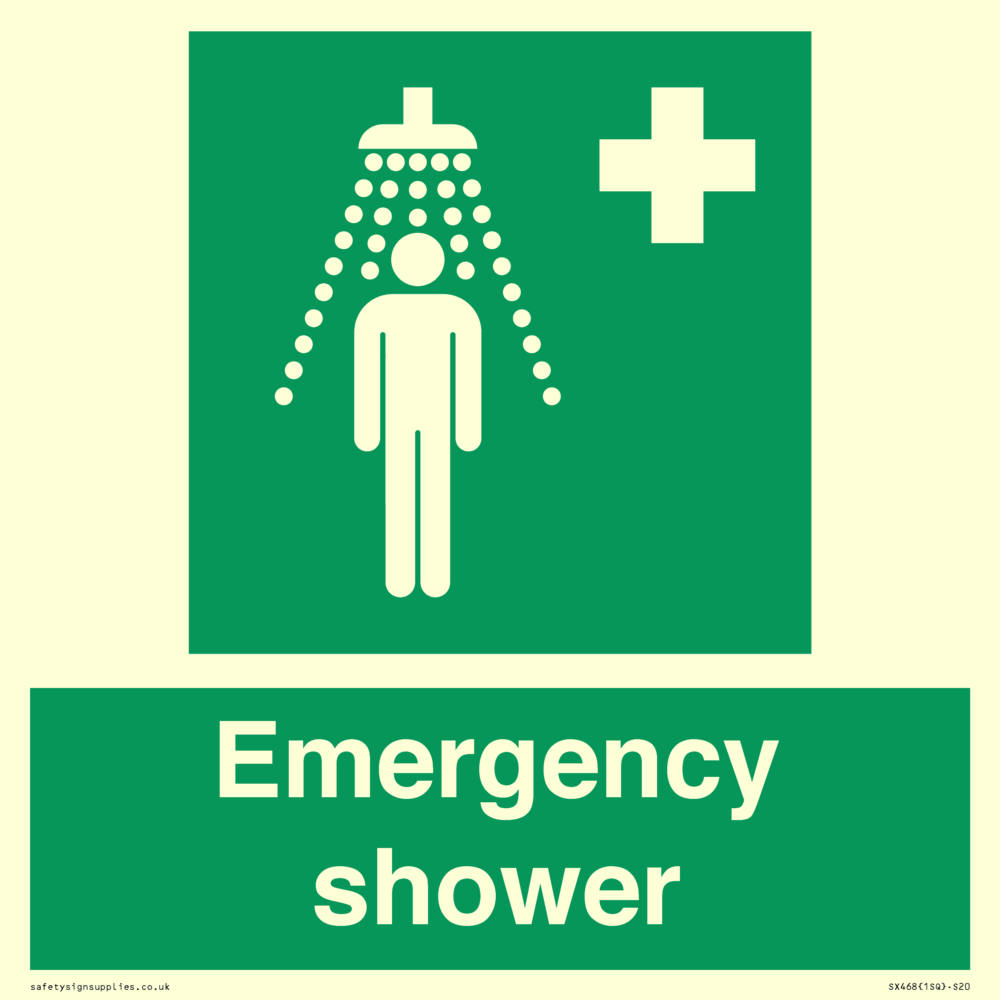 Image content: Human figure under running water coming out of a shower head, first aid cross.