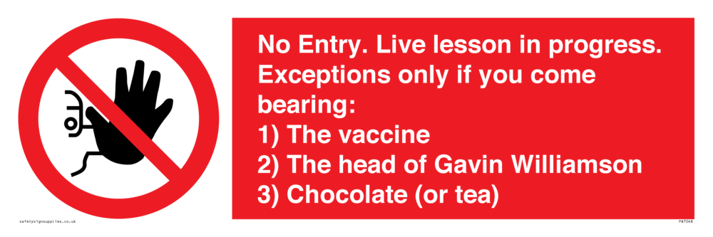 Sign Text: No Entry Live lesson in progress. Exceptions only if you come bearing: 1) The vaccine. 2) The head of Gavin Williamson. 3) Chocolate (or tea)