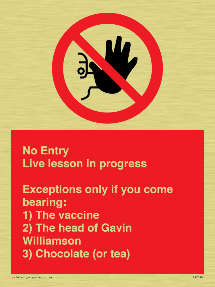 Sign Text: No Entry Live lesson in progress. Exceptions only if you come bearing: 1) The vaccine. 2) The head of Gavin Williamson. 3) Chocolate (or tea)