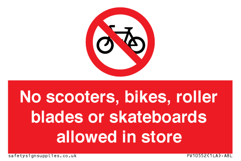 No scooters, bikes, roller blades or skateboards allowed in store Sign