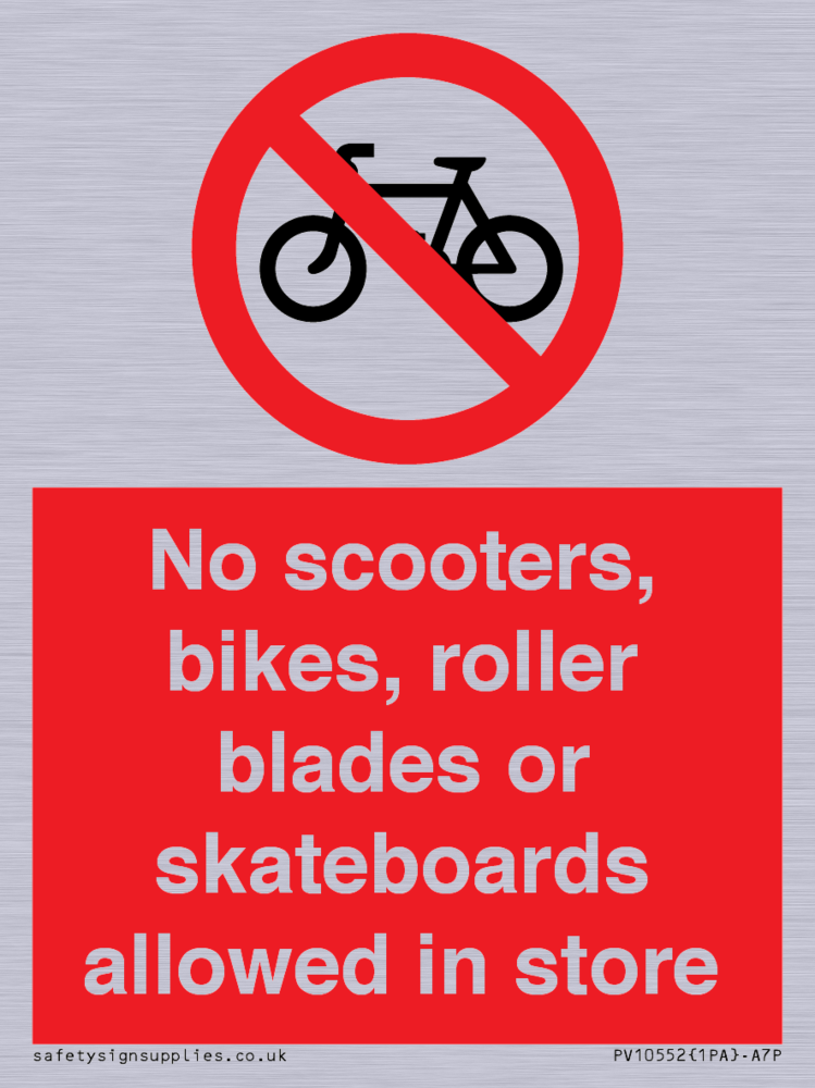 No scooters, bikes, roller blades or skateboards allowed in store Sign